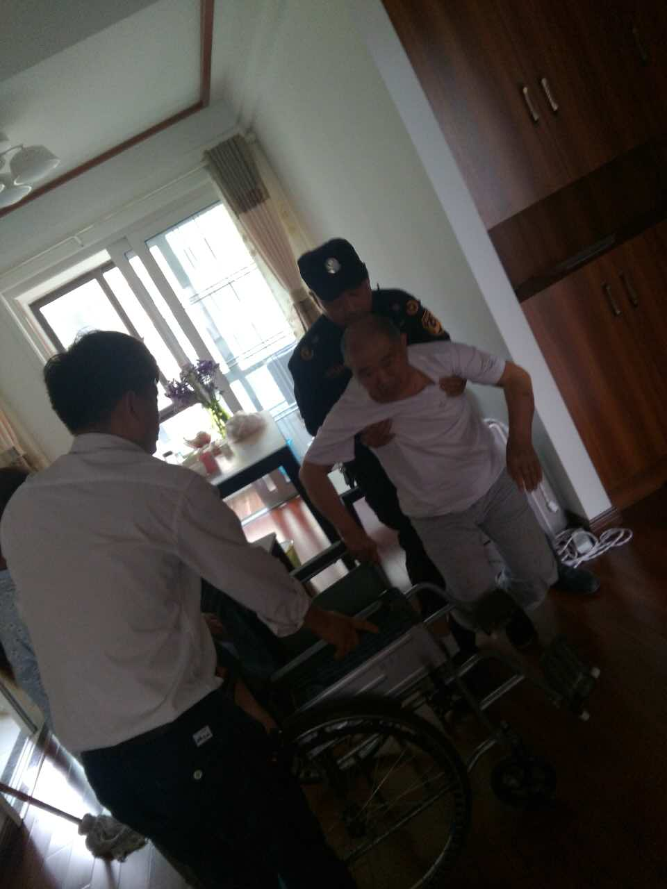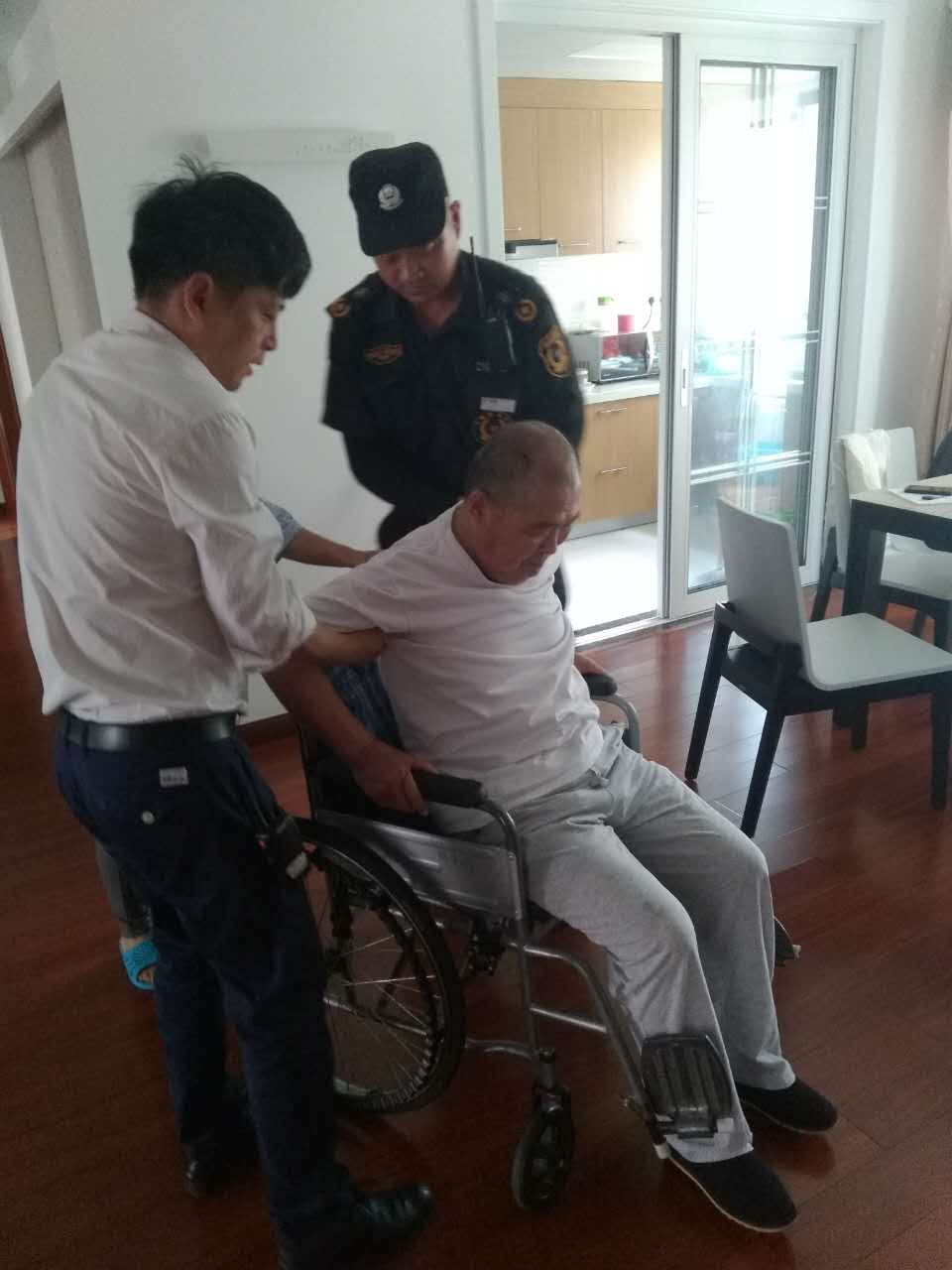 (业主家老人不小心摔倒,物业人员上门帮忙搀扶)