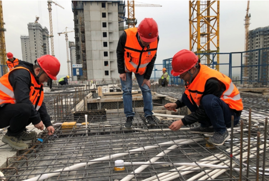 滨湖沁园代建项目党员带上安全帽,穿上防护背心,亲身体验了施工现场的钢筋绑扎、墙体砌筑,与农民工兄弟交流操作难点,分享操作经验。